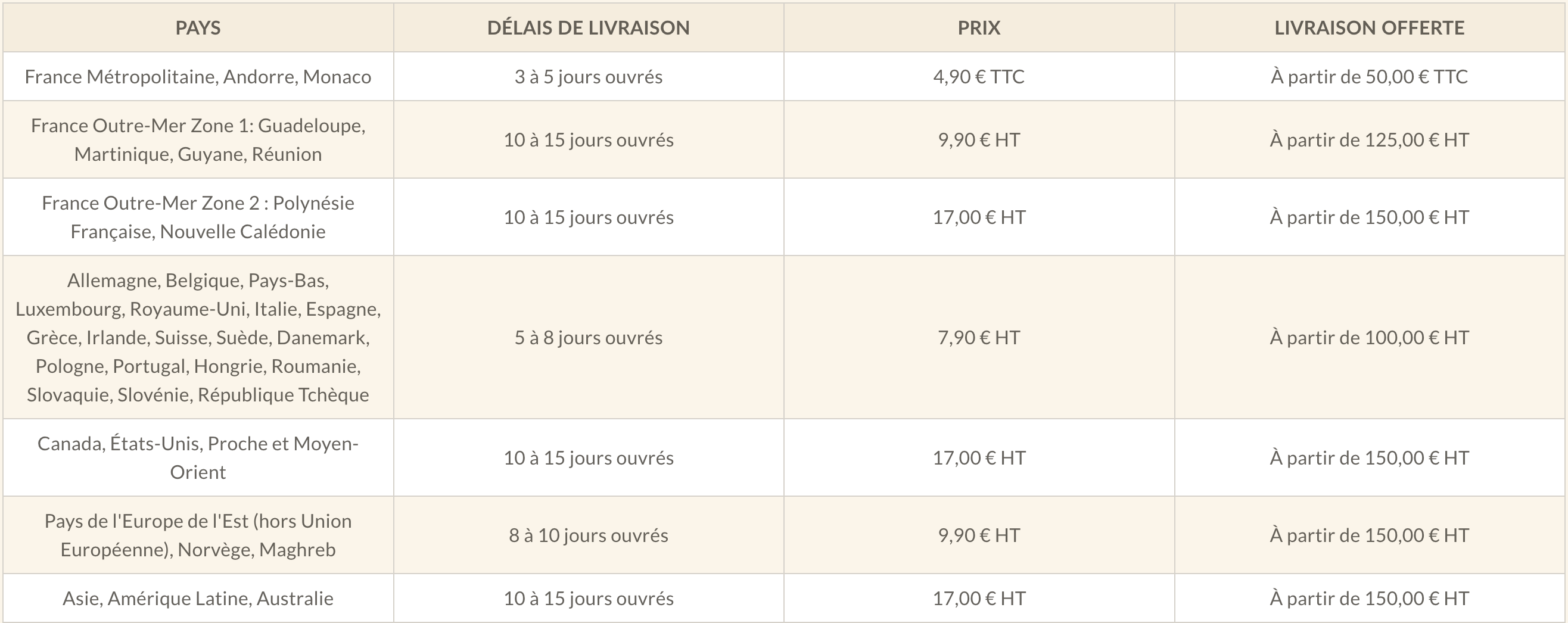 Les délais et frais d'envoi varient en fonction de la zone géographique de livraison. Vous trouverez ci-dessous une estimation de vos frais de livraison selon le montant de la commande et le lieu de livraison. Les frais d'envoi sont offerts à partir de minimas de commandes par zone géographique.